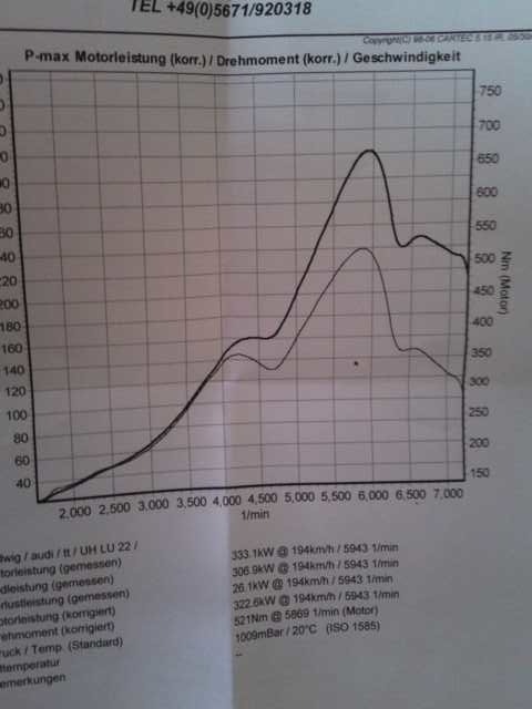 so leute, gestern war der grosse tag bei sls. ich weis gar nicht wie ich´s sagen soll weil ich selber von den socken war. vor dem ersten lauf hatten wir das auto erstmal 10 min vor dem lüfter stehen damit er etwas abkühlt dann die mesung mit ca 460 ps und 547 NM. wir haben uns nur angeschaut und gesagt da stimmt was nicht. also nochmal alle parameter am prüfstand überprüft und einen zweiten lauf gemacht. nun war der tt natürlich wieder warm. nächste messung ergab dann 322,6 kw, was 438 ps entspricht und 521 nm.